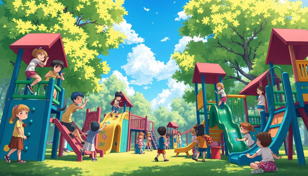 A vibrant playground scene filled with children enjoying a sunny day, climbing, sliding, and playing together amidst lush greenery.