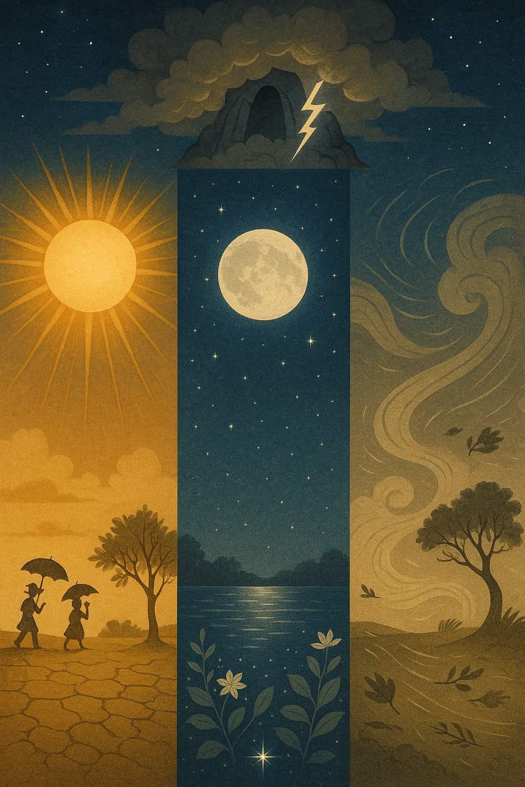 Long, long ago, in the vastness of the sky, there lived three children of the Evening Star: the bright and powerful *Sun*, the swift and restless *Wind*, and the gentle, glowing *Moon*.
