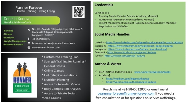 As an experienced health and wellness coach and an accomplished ultramarathon runner (author of the book BE A RUNNER FOREVER), I help individuals to achieve their wellness goals - Running, Fitness, Diet & Nutrition, Weight Management, and Diabetes Reversal. You can reach out to me for a free consultation.