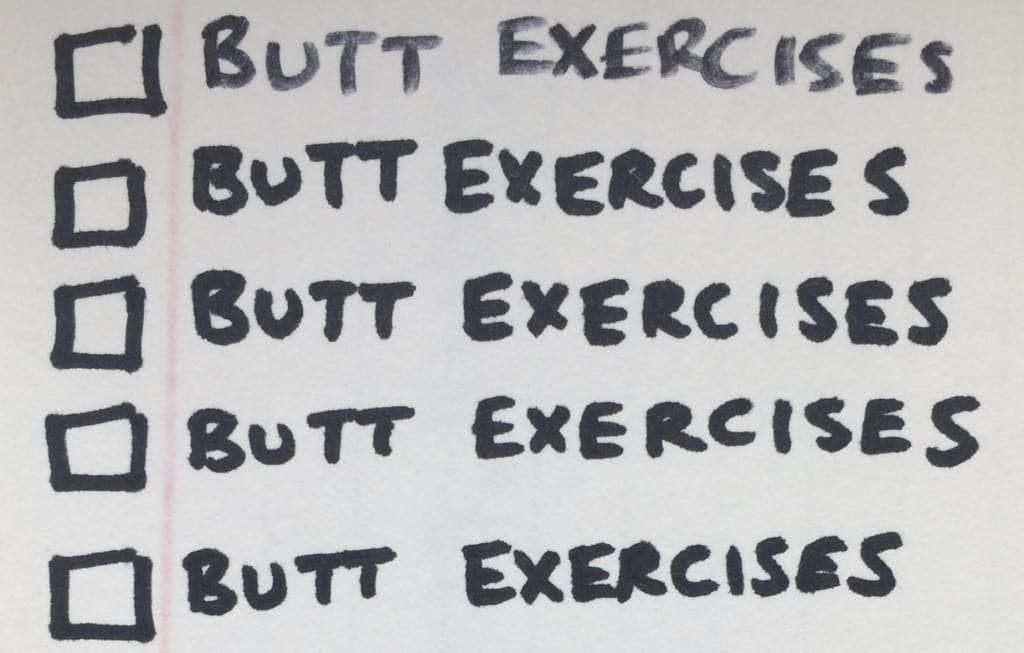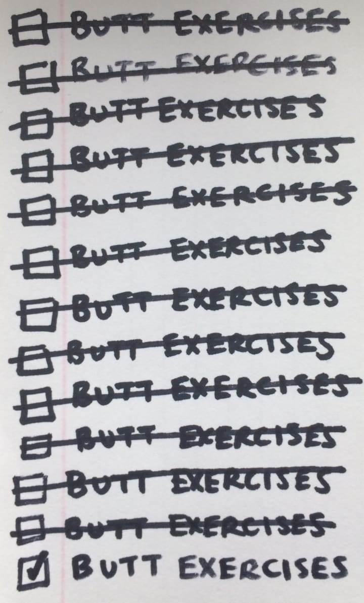 I haven't done my butt exercises in 192 days. That's after having installed an app on my phone specifically for butt exercises. That's even after having adjusted the settings to remind me to do butt exercises every day.