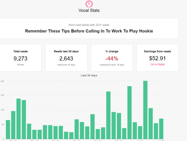 For tips on how to get your reads up, I wrote this when I was nearly at 6,000 reads and wondering if I should stay or not. I have a planned article once I hit 10,000 reads, as long as the research proves to be true. Keep your fingers crossed because it is about how to make better money on Vocal.