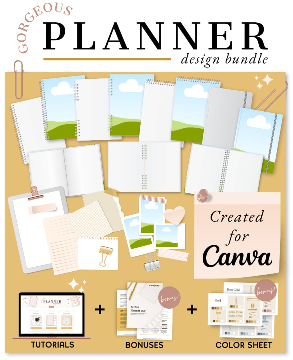 You cannot find the elements of the Gorgeous Planner Design Bundle [ ADD YOUR AFFILIATE LINK] anywhere in Canva. It's not Canva Pro!