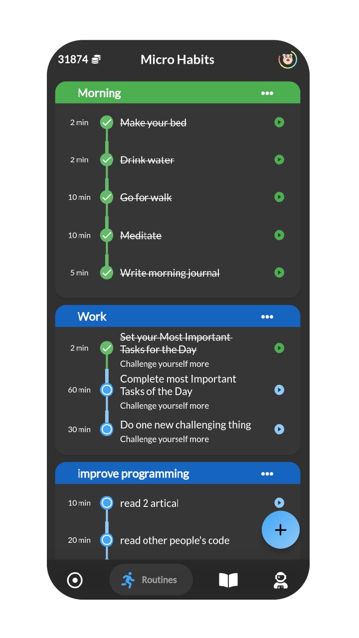 Routines are a combination of your new habit with an existing habit. This technique is a good way to start integrating your new habit with an existing routine. Everyone has a morning routine, such as making bed->brushing teeth->drinking coffee, and you can easily add a new habit, such as going for a 10-minute walk after drinking coffee.