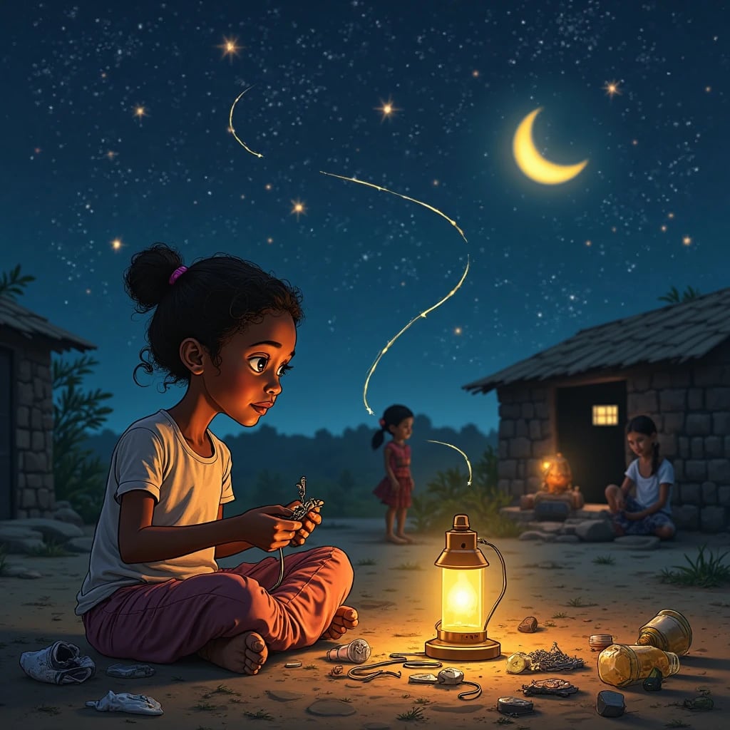 One night, as the kerosene lamp sputtered and died, Afiya stepped outside in frustration. She looked up at the stars — quiet and constant — and an idea sparked in her mind. The moon was bright. The stars gave light. The sun, even after it had set, had filled the sky with beauty.