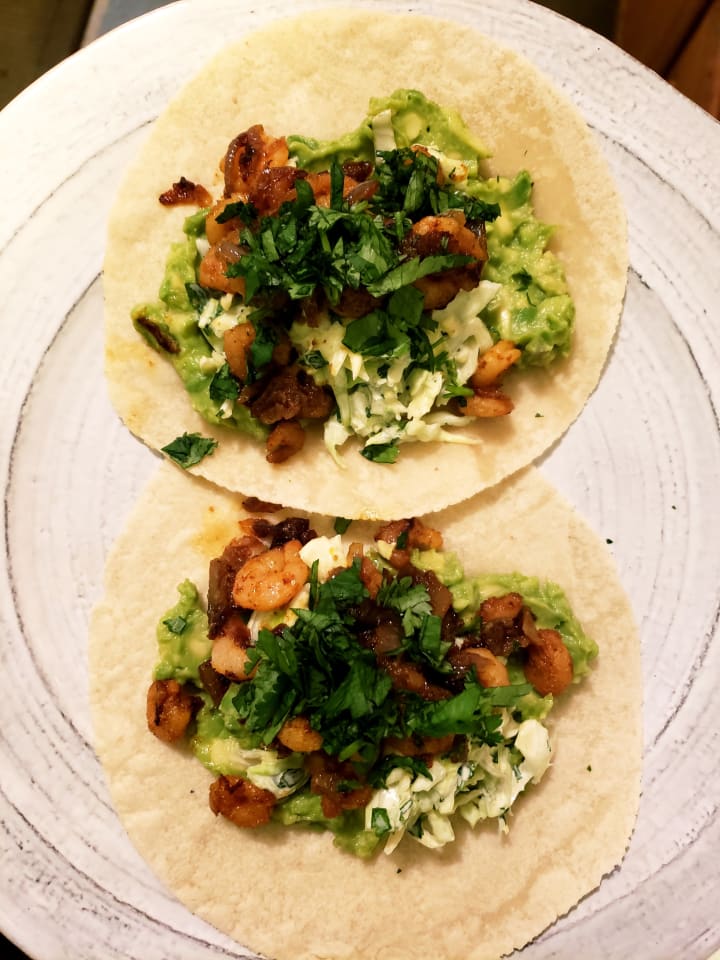 All that’s left to do is mash up an avocado with a spoon of pickled jalapenos and voila! Time to take out a tortilla and build my taco, layer by layer. Guacamole, shrimp, slaw, cilantro garnish. Repeat.