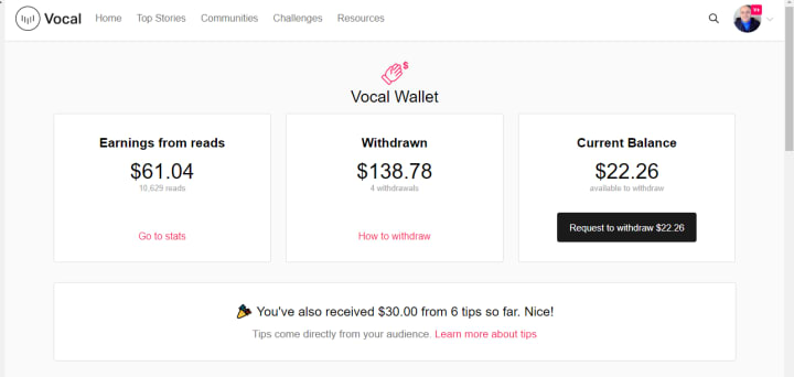All total I have racked up an unimpressive but equally rewarding $160 dollars and change while I've been on Vocal. With just over $61 of it being from reads that leaves just below $100 of it coming from tips and bonuses. After 8 months on the platform and two months of being a $9.99 a month Vocal + subscriber, it's been a good experience overall for an amateur writer whose only professional writing experience before this was lengthy reports about arrestees and inmates in the criminal justice system.
