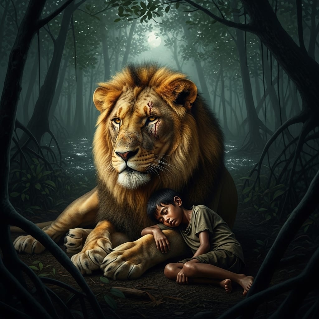 Day by day, survival became possible because they were together. The lion led Kavi to hidden pools where fish darted beneath the mangroves. When the boy collapsed from exhaustion, the beast nudged him awake, as though unwilling to let his fragile shadow fade.