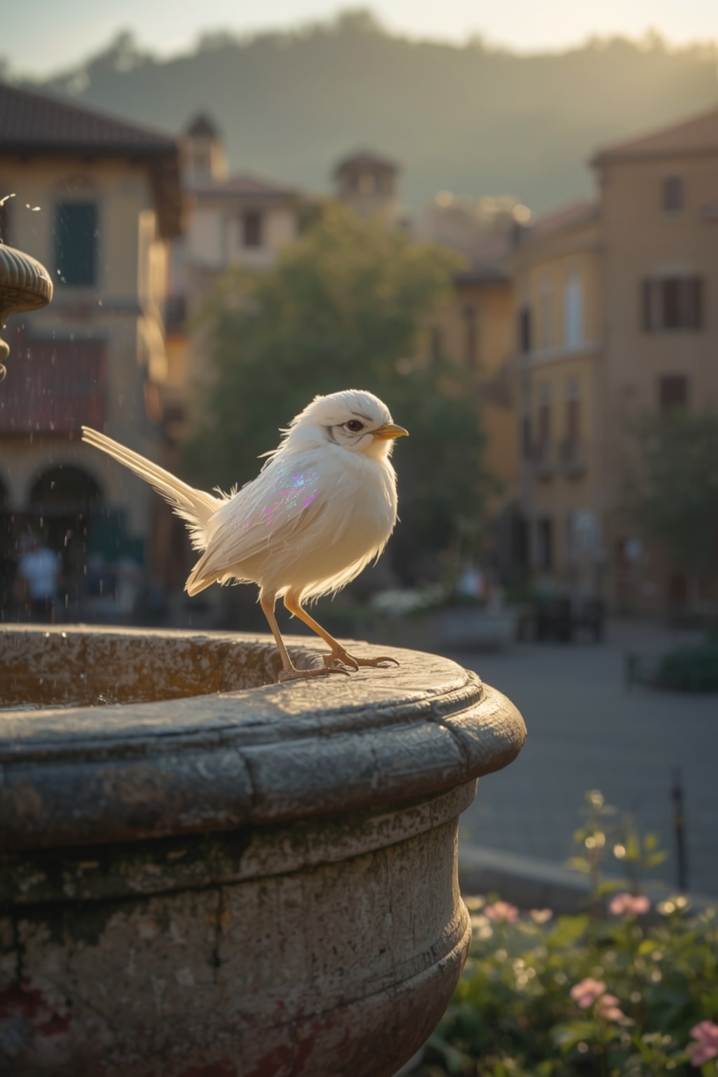 Old Mira, who swept the steps of her bakery every morning, spotted it perched on the fountain in the town square. It was small and white, with feathers that shimmered like morning frost. Its eyes were bright, curious—almost knowing.