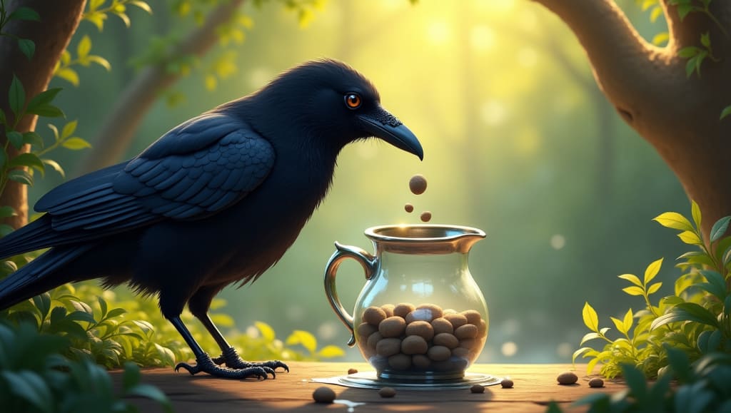 In a vast, sun-drenched forest, where tall trees swayed in the breeze and animals roamed freely, there lived a crow named Kavi. Unlike other crows, Kavi was known for his sharp mind and clever ideas. Whenever the animals faced a problem, they would turn to him, and he would always find a way to help.