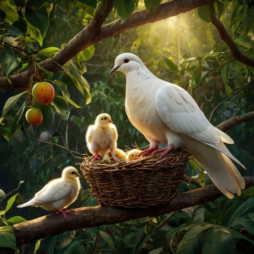 In a quiet, green garden stood a tall, dense tree. Its wide branches provided shelter to many small creatures, but on the highest branch lived a gentle dove with her tiny chicks. She had carefully built her nest there, weaving it with twigs, soft leaves, and bits of straw. For her, this nest was more than a home—it was a place of safety and joy where she could care for her young.