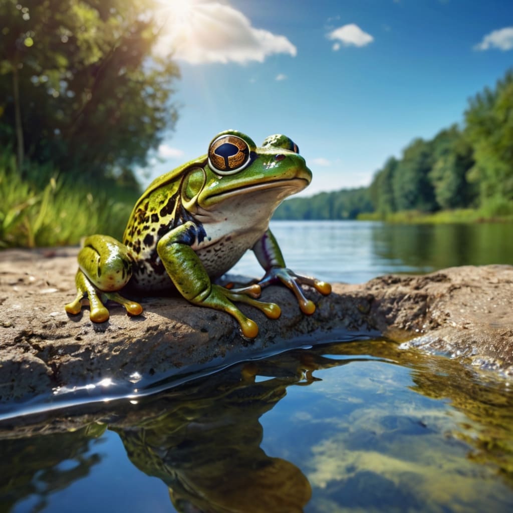 The frog floated for a moment, stunned by the sight before him. The water stretched as far as his eyes could see. The current moved with a gentle power, glimmering under the sunlight. Schools of fish darted through the water, and the sound of the flowing river filled his ears.