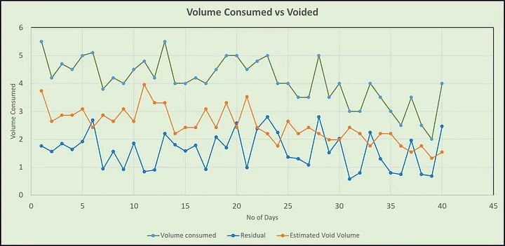 Graph showing the different daily intake and output over the 40-day trial.