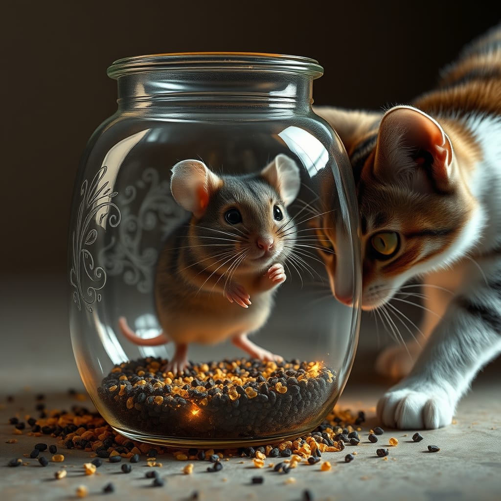 The huge cat was clearly looking to eat him while he was trapped in a jar that no longer had any food but was full of mouse feces. He was too fat to run even if he could escape when the cat knocked over the jar. His legs didn’t work well anymore.