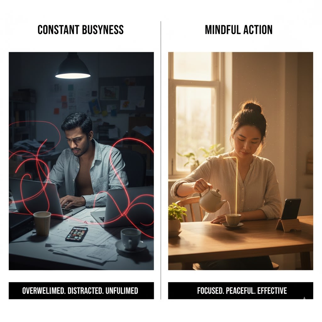When you shift from constant busyness to mindful action, something surprising happens. You achieve more meaningful results while using less energy. You become more focused, more peaceful, and more effective.