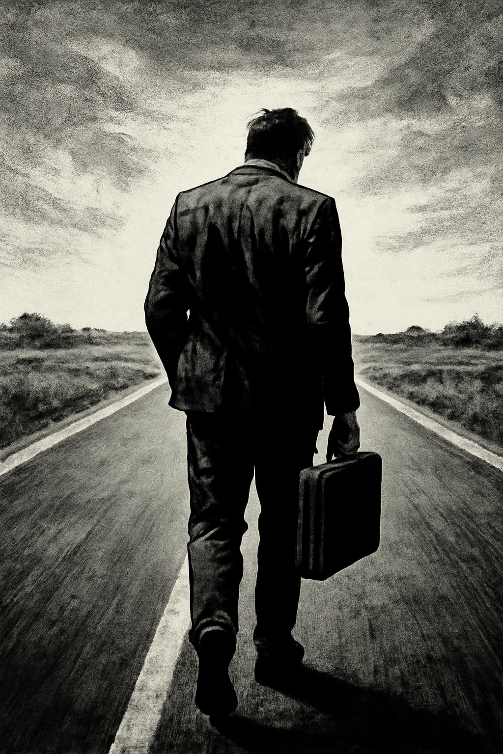 The wind whipped through the empty expanse, pulling at the edges of the man's rumpled suit and tugging at his loose tie. His briefcase swayed gently with each step, the papers spilling out just enough to reveal their worn edges. In the distance, the road stretched out, disappearing into the horizon, endless and devoid of life. His feet hit the pavement with a steady rhythm, and yet, despite the constant movement, he felt stuck in place. There was no escape from the road he had chosen. The road of rejection.