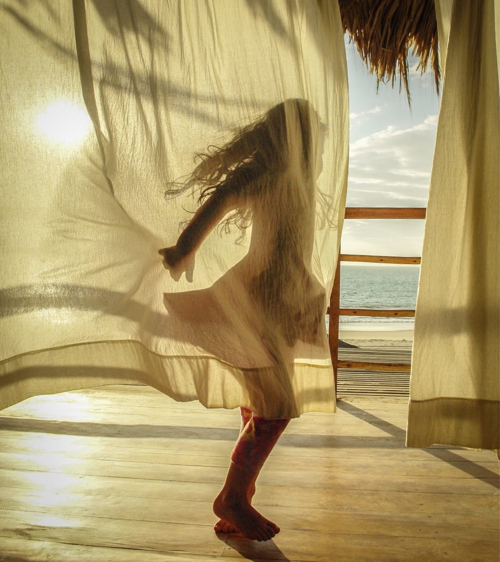 The temperature was pleasant and there was just enough of a breeze to give life to the curtain. With the sun behind them, my daughters began to spin and twirl, and I surreptitiously grabbed my camera and knelt to capture the moment.