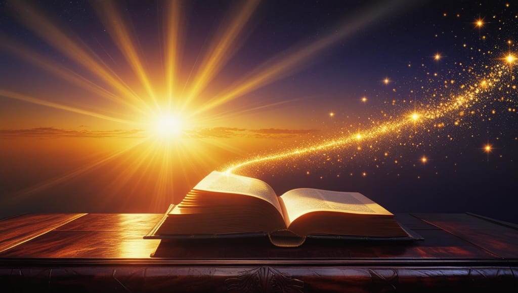 Image Prompt: A vibrant sunrise over an open book, with rays of light illuminating a path leading to a distant horizon filled with stars, symbolizing hope, knowledge, and endless possibilities.