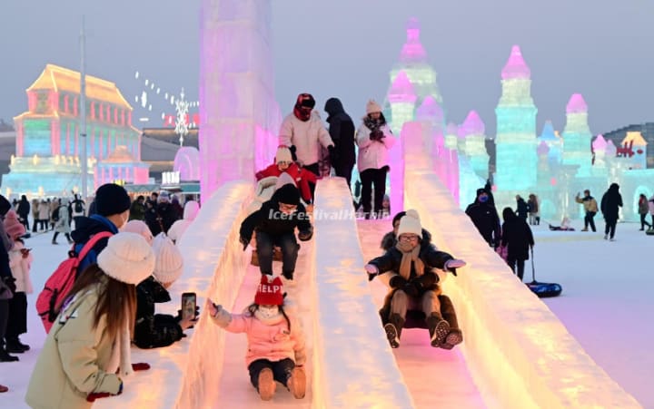 Explore the festival's various themed areas, including the Ice and Snow World, the Ice and Snow Wonderland, and the Sun Island Park.
