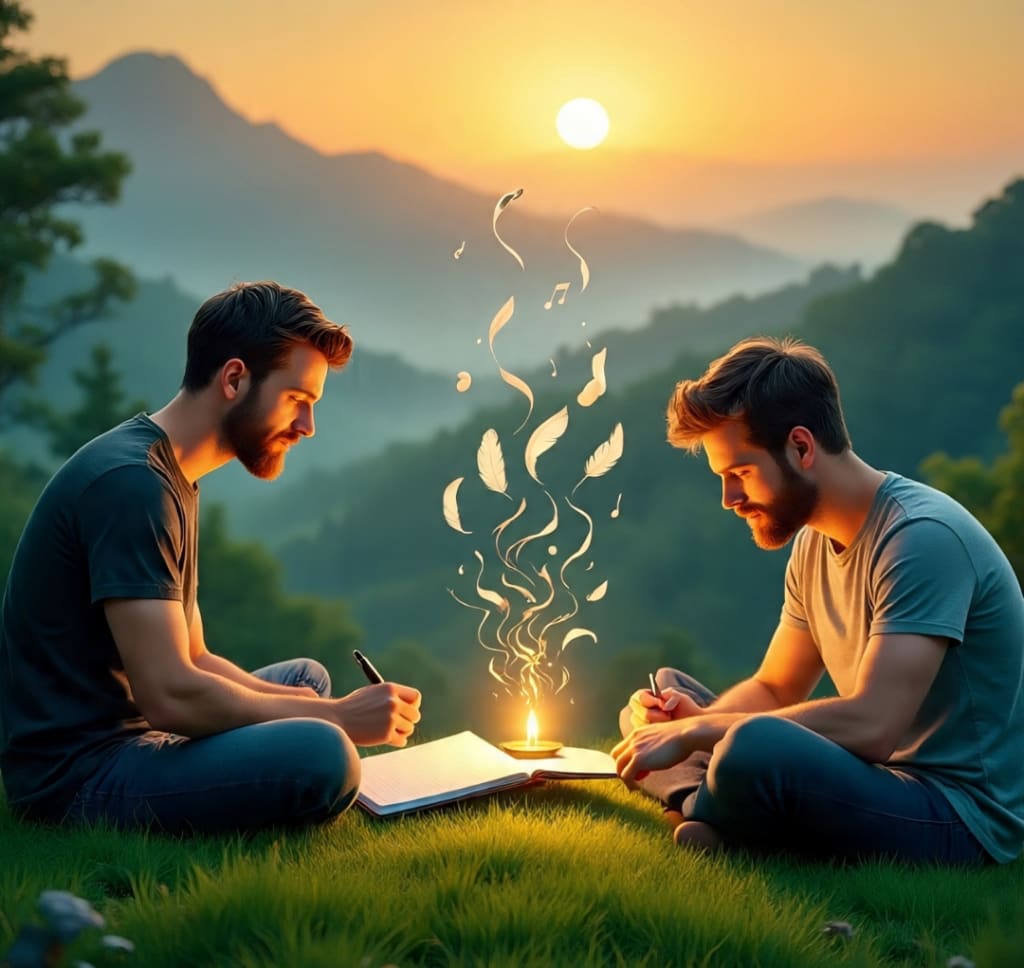 One quiet morning, Aayan climbed a small hill near his home, carrying nothing but a notebook and a pen. The sky glowed softly with shades of orange, gold, and pale blue. As he reached the top, he saw two other men already sitting on the grass—Arham, who wrote thoughtful poems, and Saif, who loved telling inspiring stories. They greeted him with warm smiles.