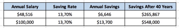 If you are lucky enough to be one of the 9% of Americans who make a 6 figure salary, the calculations are naturally better but still far from being spectacular. With an annual salary of $100,000, you could save more, but lifestyle inflation is a real thing. The more you earn, the higher your average spendings go. So, let’s keep considering a 13,70% saving rate. After 40 years of work, you would retire with $548,000 in your savings account. A whole life working, and you’re only a half millionaire.