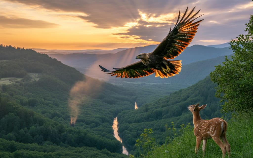 Arion’s kingdom stretched far and wide. To the east lay endless forests where foxes hunted and deer grazed. To the west, a river sparkled, winding like silver thread beneath the sun. Every creature who glanced upward admired the eagle’s flight. Some envied it, others feared it, but all respected it. Yet, with great height often comes solitude. Arion was powerful, but he was alone.