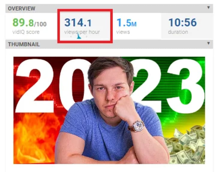 Next, check VidIQ (or TubeBuddy, both YouTube research tools, look them up if you don’t know them), to see if the video is still getting a significant amount of views per hour.