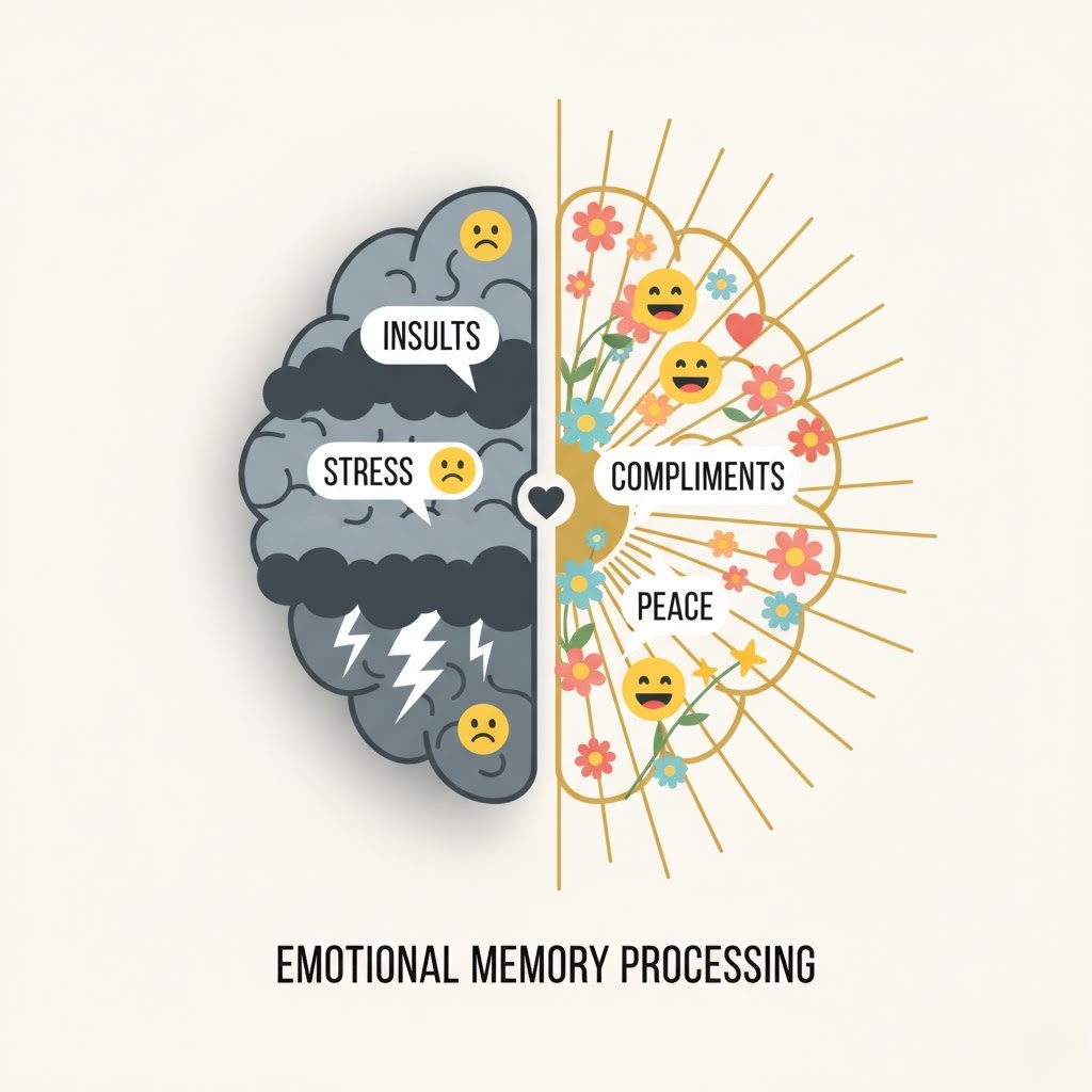 A compliment feels great in the moment, but your brain doesn’t treat it as something urgent or dangerous. It’s like a warm breeze — pleasant, but passing. Insults, however, are like storm clouds. They trigger self-doubt, fear, and even shame, which your brain treats as potential “threats.”
