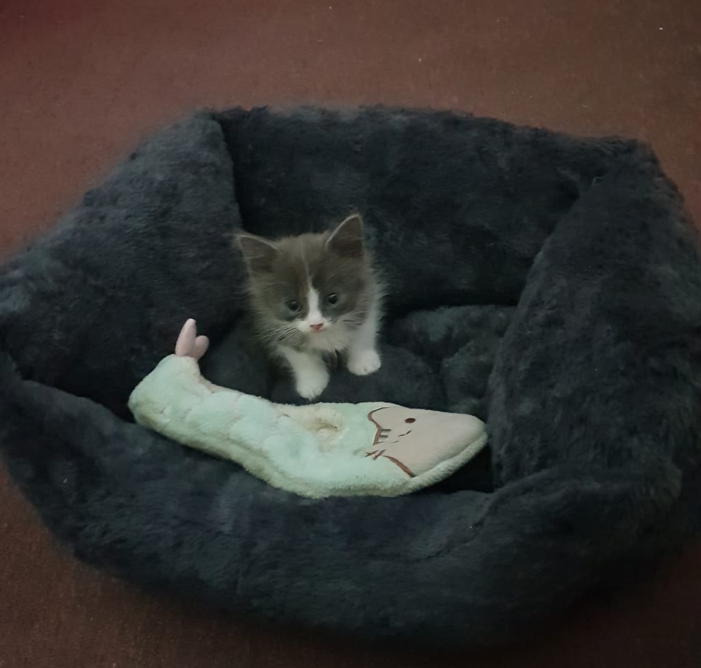 He didn't know how to drink or eat properly and didn't know how to play so we had to help him, the vets said he was very underweight and obviously wasn't being looked after properly before we got him as he was around 8 weeks old and weighed less than 1 kilogram.