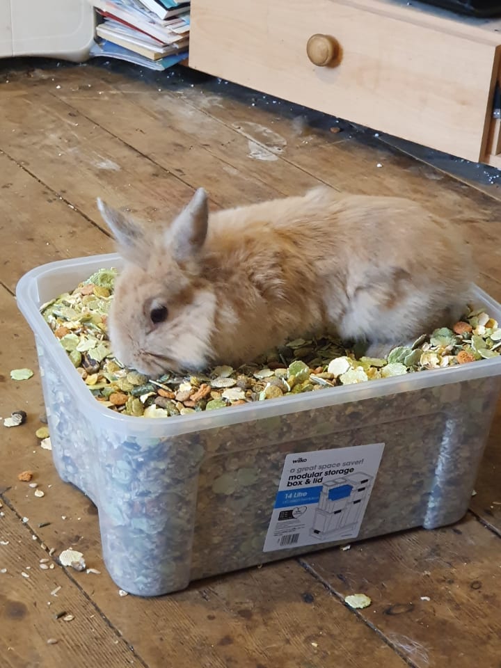 Our two rabbits, Bun Bun is the bigger white rabbit and is nearly 2 and is very greedy, doesn't like to be picked up but will come for treats, he loves to run around and explore in the garden.
