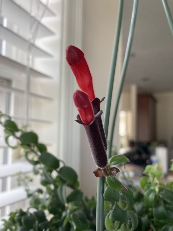 The Curly Lipstick plant is a fascinating and whimsical looking semi-succulent vine. Especially exotic when it blooms its phallic looking cherry red namesake atop cascading dark green waxy leaves that resemble ribbon candy. One may catch themselves staring at this lush eye-candy often and for great lengths of time. It’s easy to fall in love with it.