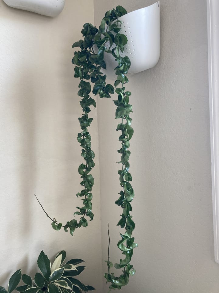 Hoya Carnosa Compacta are native to Australia, India, and Asia. This one below loves hanging from a modular wall planter located somewhere in the Southeastern US. When it was planted 1.5 years ago, it was only 6 inches long on one side, 1 inch on the other (the longest rope currently), and the piece in the middle maybe grew 1 inch the entire time. Wild!