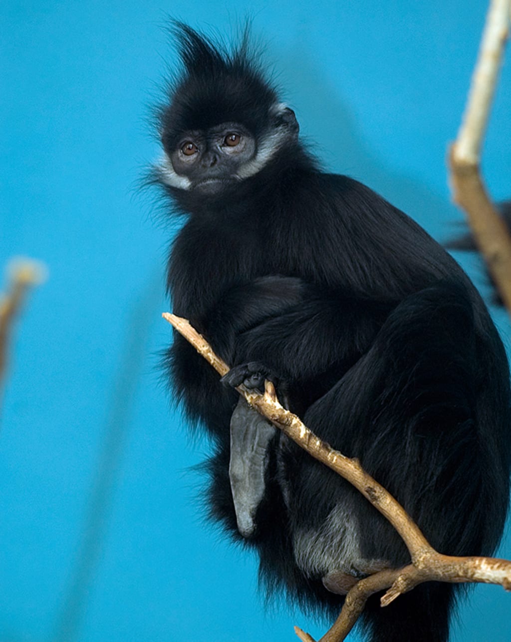Francois Langurs are covered by black fur all over their bodies except for white stripes that stretch from the mouth to the eyes. On top of their heads, they have a triangular peak and a white crest that looks like an eyebrow above the eyes.