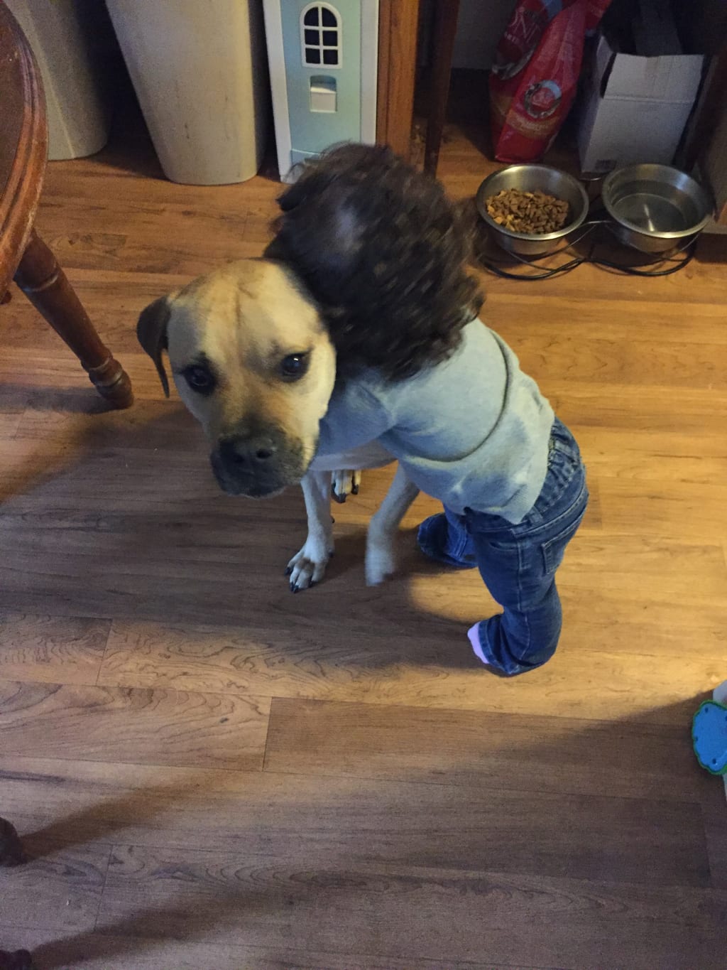 When I found out I was pregnant with my daughter, Dolly became a constant companion. She followed me throughout the house, something she continues to do to this day and was practically my shadow as my daughter’s birth approached. Upon their first meeting, Dolly was hooked, and there was no doubt that this was her baby. Once considered as “nanny dogs,” Dolly takes this role very seriously. She slept close to wherever my daughter slept. As my daughter became more mobile, Dolly was always in short-range, always giving my daughter licks. As she was learning to walk, Dolly’s patience and care were evident as the toddler used her to stand. She never snapped or snarled, merely kissed her baby when she fussed.