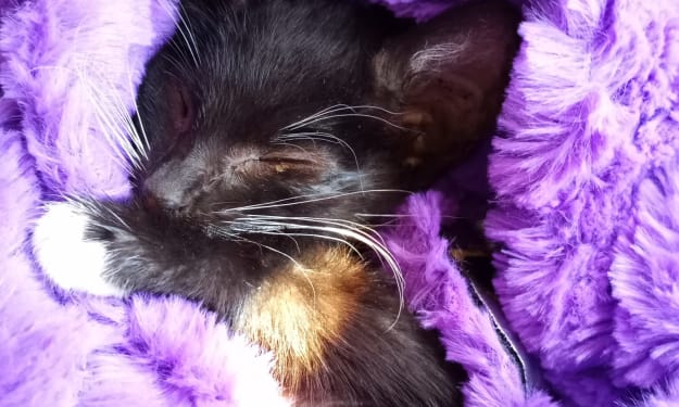 Jet is another heartwarming story. Blind and frightened at weaning age. His eye sockets were red rimmed and crusty. He had an infection that had welded his eyes shut as they tried to heal. The veterinarian said he would never see. But they didn't know Jet. Somehow one eye had a tiny opening and from that peep hole Jet learned to view his world. I noticed one day that he could follow my hand movement. Certain now he had vision, several surgeries later and he became a fully sighted cat. He was thrilled with his new view of the world. He became so close to us during his convalescence that he became a permanent fixture in our home. He darts into the bedroom every morning to give my hubby a wakeup call. Hubby was the first human he knew in his blindness. And hubby took care of him through it all.
