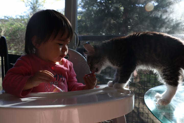 When we first introduced them to each other, Plato was growling a little and was a bit territorial. But after one day they were snuggling and grooming each other. And they always join us when it's time for bed. It doesn’t get better than that! Come to Daddy!