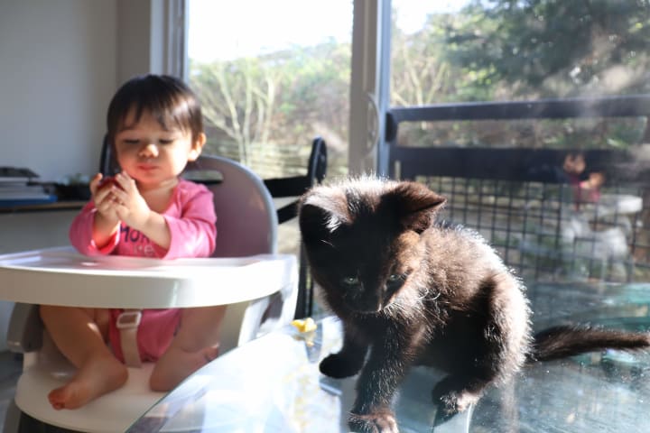A few days later we adopted Luci from a town two hours South of us. He’s an all black cat just like Harry baby. I was specifically looking for an all black cat because of Harrison my hairy son. He's a little different from Harrison, but he’s a sweet kitty. All he wants to do is cuddle. He’s a little stiff and awkward in his movements, so we think he may have been the runt of the litter, but it just makes him more cute.