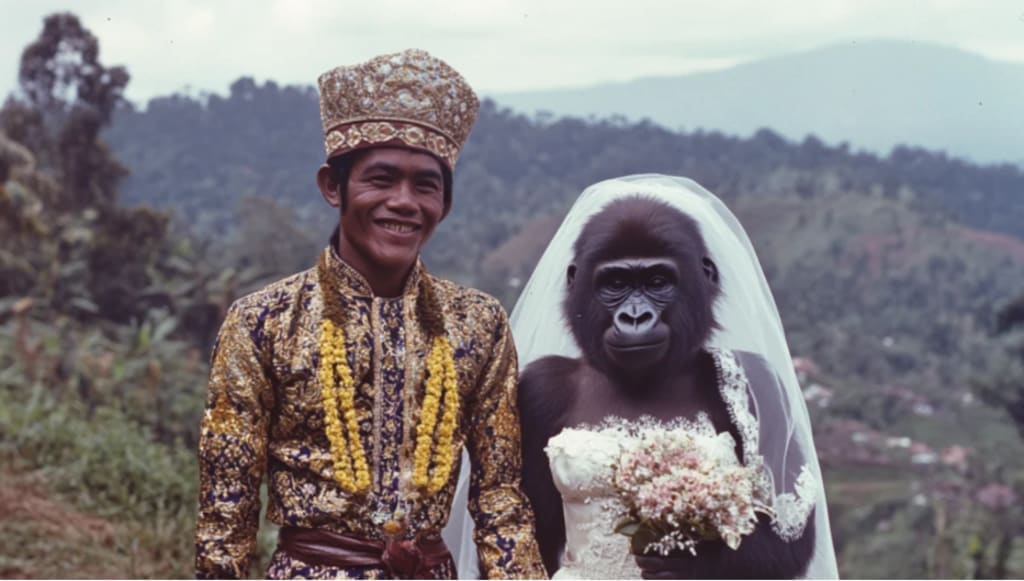 All from far and wide came to see this ceremony,intrigued by this odd pairing.The groom,a middle-aged man with a determined expression, proudly stood next to his bride a female gorilla wearing a wedding gown. The glance back to the love-drenched face of the groom stood in stark contrast to those who had come to witness the nuptials.
