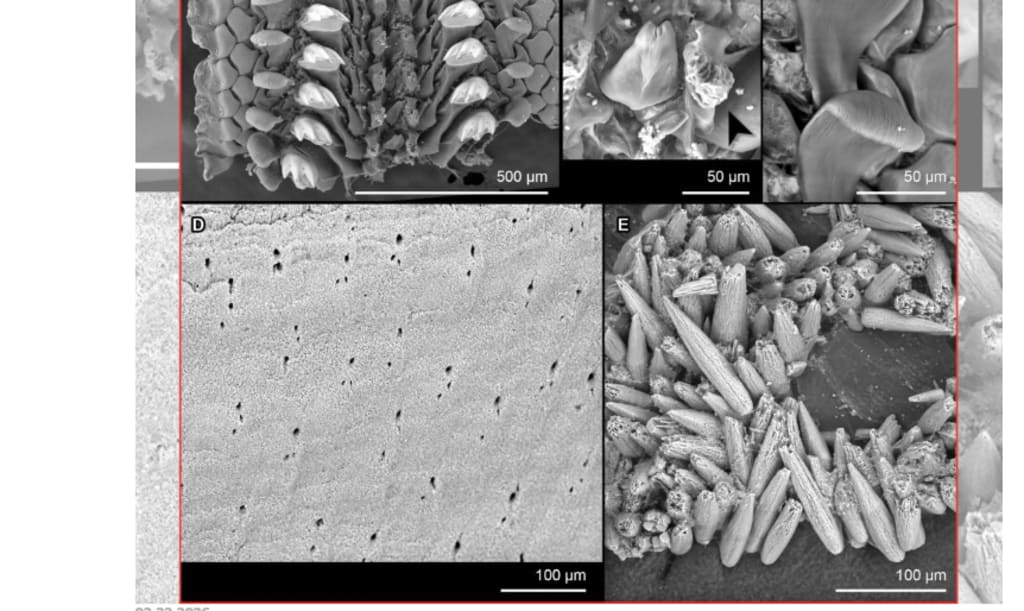 The mollusc scraped food using a metallic-coated ribbon of teeth called a radula while it was feeding. Because iron minerals toughened the tooth tips, grit did not wear down with each pass.