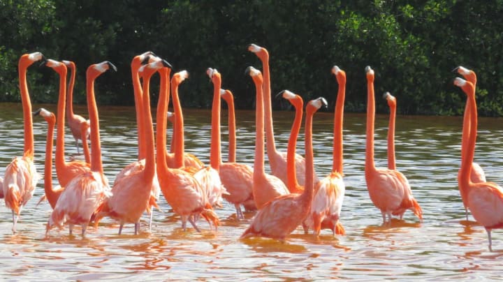 I love seeing flamingoes with their incredibly long legs and all those pink feathers. A flock of flamingos is known as a flamboyance. The word flamboyance means "strikingly bold or showy" This is a great way to describe flamingos because these birds range in color from light pink to bright red and they certainly are showy.