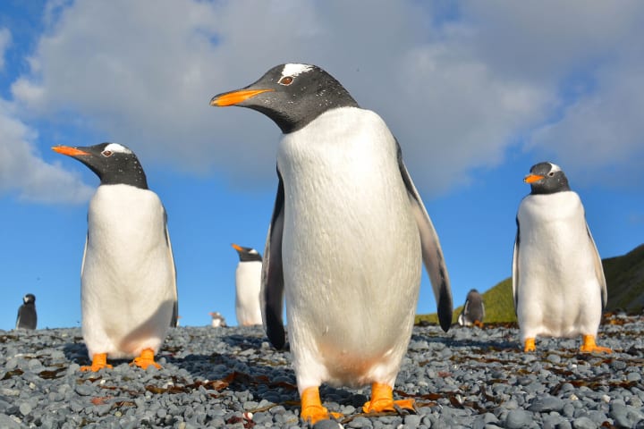 Gentoo penguins make their home on many of the islands of the Antarctic region. Their main colony is on the Falklands. These penguins have white patches around and behind their eyes that join on the crown. Their bills are reddish-orange and they have orange feet. Their diet consists of a mix of crustaceans, small fish, and squid.