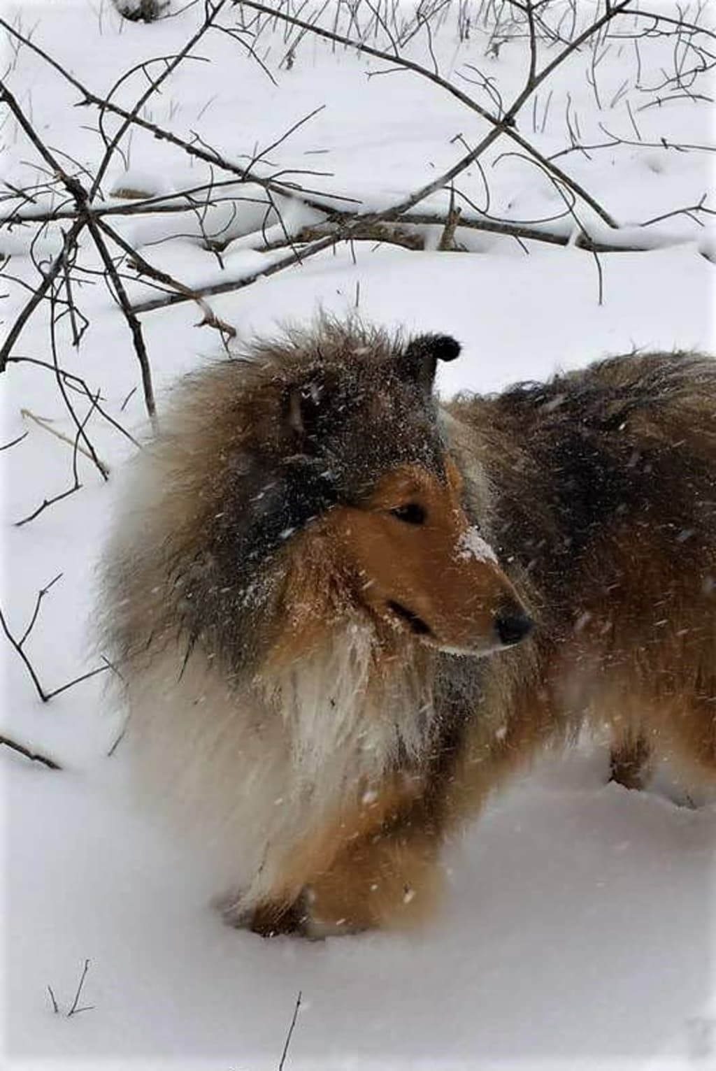 Gustav, being a Rough Collie ("Lassie" dog), had a glorious full coat to keep him warm. He trotted merrily along, wolf-like in his joy. Every so often, he came to me for assistance removing ice balls from between his paw pads. He could get them out himself but preferred I do it. My fingers were more adept than his fangs, but also more prone to freeze. It was a labor of love.
