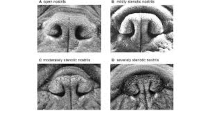 the nose is pushed into the face this is known as the brachycephalic form which essentially causes an obstruction of the airways which is why you will see most of these breed snorting, snoring heavily and finding it hard to breath and regulate their temperature soif they over heat which is very common this can be fatal as well as needing to keep them warmer than the average pooch. I would seriously recommend BOAS surgery, all 5 elements.