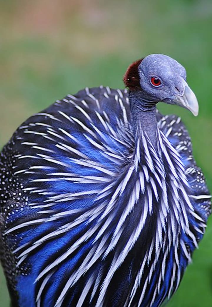 Vulturine Guineafowls have distinctive coloring and blood-red eyes. They are also referred to as "royal guineafowls." Their diet consists of rodents, small reptiles, insects, plus vegetation, seeds, and fruit on occasion. These birds are native to east tropical African countries such as Ethiopia and Kenya and they thrive in dry desert conditions. Vulturine guineafowls are fast runners and can fly but do so rarely mostly only when they want to reach a roosting perch.