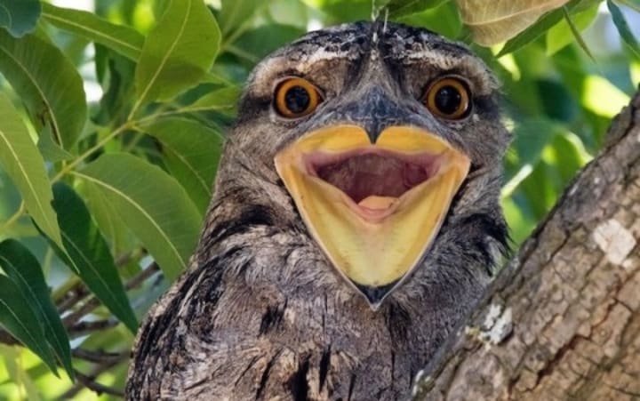 Frogmouths have wide mouths for eating prey. They are carnivores and are known to eat lizards and rats but will also eat berries and fruit. They make their homes on the Australian mainland and in Tasmania where they blend in with local trees.