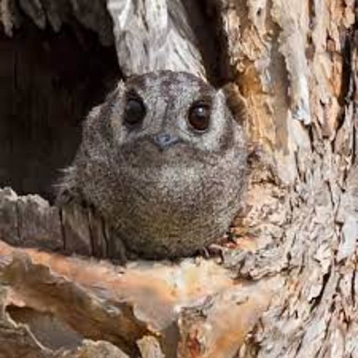 Ptoos come from a lineage of ancient birds and many species have distinctive wide mouths and bulbous yellow eyes. Rufous potoos live in northern South America mostly Ecuador and Peru. They're camouflage specialists and can blend in with dead leaves, brush, and trees. They sit on perches to catch flying insects.