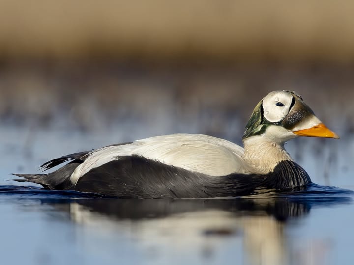 Spectacled Eiders get their name from markings around their eyes that make it seem they're wearing glasses. These are artic seabirds that can withstand cold temperatures and thrive in the tundra as well as western Alaska. Their diet consists of mollusks and in the summer they eat grass and berries.
