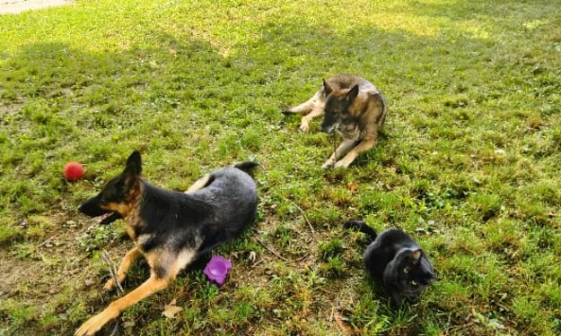 Three years later, I am engaged to a wonderful man and our combined menagerie is much different/smaller than it was at the time I helped Jimmy. We now have three cats: Dexter Morgan, Midnight, and Daisy (all who were part of the group that met Jameson)— and we also have two big German Shepherds: Princess and Goldie.