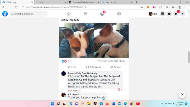 The post I made on Facebook on Saturday where I wrote about finding him... it garnered 37 comments and had 187 shares! Those shares made all the difference!