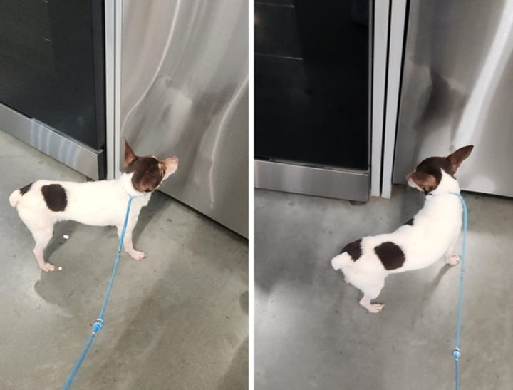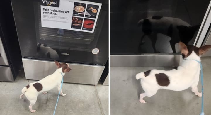 Imagine seeing yourself in a funhouse mirror for the first time, but you're a toddler and still have no idea about object permanence. Buddy spent a good 30 seconds staring between the stoves, behind the stoves, trying to figure out the mystery of the other dog. If he'd been a toddler, he'd have stood there and started to cry.