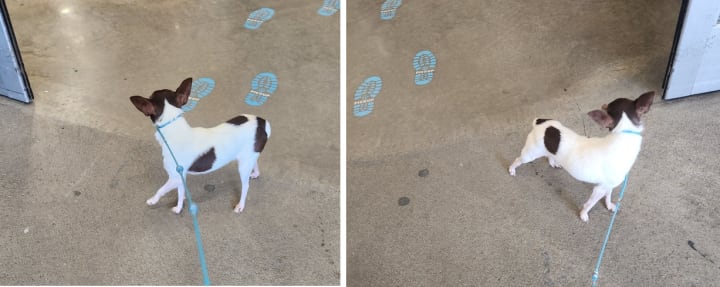 "Let's go," is our command to walk forward on a loose leash. He's just started hearing that, but he moved forward just the same. The doors swooshed open and he stopped, right in the middle of their track. I stepped forward and tried to coax him. He stood firm, even as the doors began to shut again. He turned to look at the movement. The doors stopped, their sensors detecting him in the way even though he was not immediately in the track. He stepped backward one step and the doors began to close again. He stepped forward, quelling their motion with a glance. At that moment, Buddy Understood. Automatic doors are subservient to Toy Fox Terriers. He strutted forward into the vestibule, demanding his hotdog for being such a Benevolent Ruler and Goodboy.